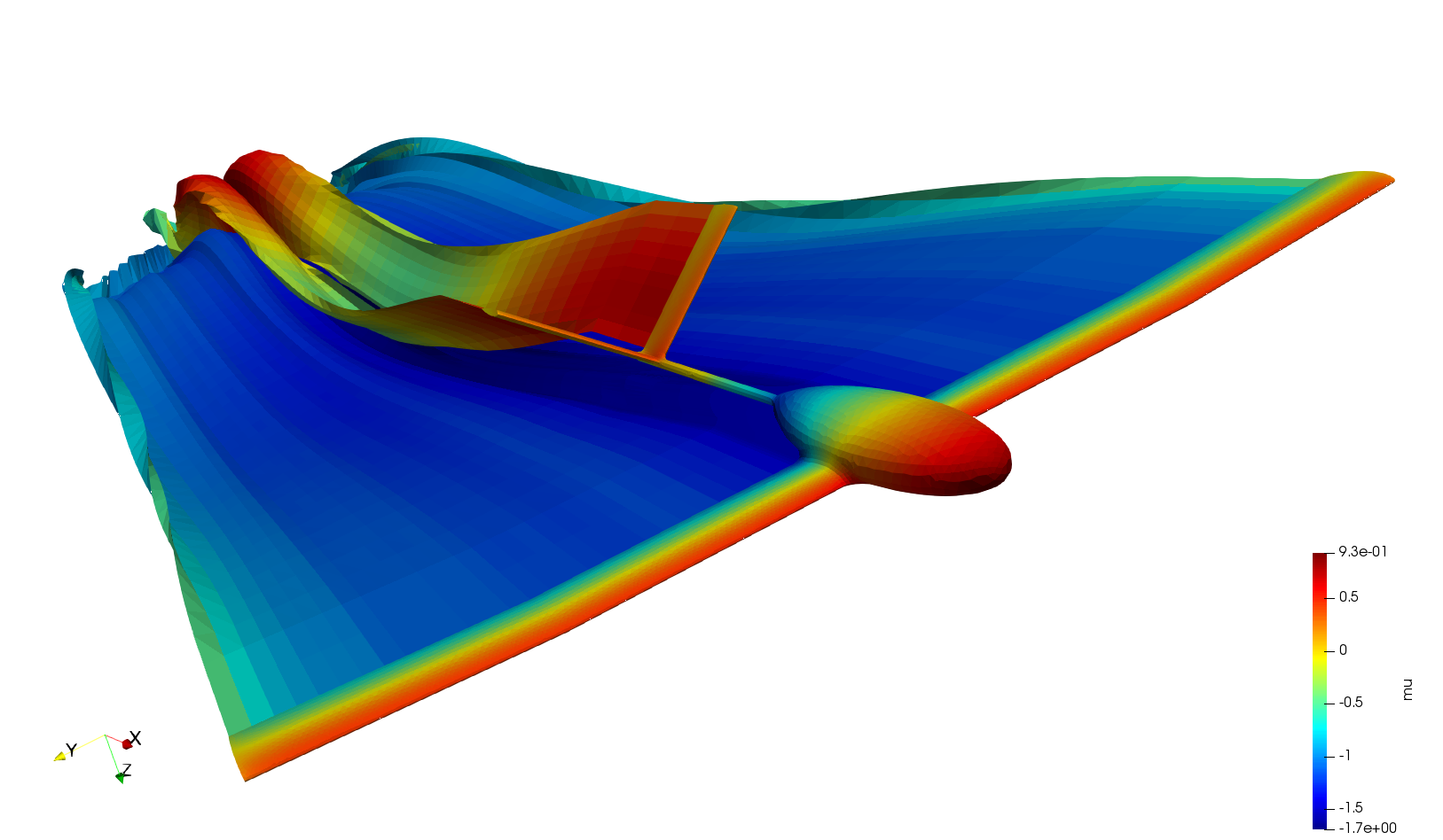 The fixed-wing UAV has a wing aspect ratio , wing area m, wing chord m, and wing span m. Both the wing and the tail have a taper ratio of 1. A body-fixed coordinate system is placed at the nose. The reference speed is m/s and the reference density, pressure and viscosity are evaluated at an altitude of m (ISA). An unstructured mesh of 24674 elements was used. The figures below show the pressure coefficient, the mesh, the panel types, and the doublet potential.